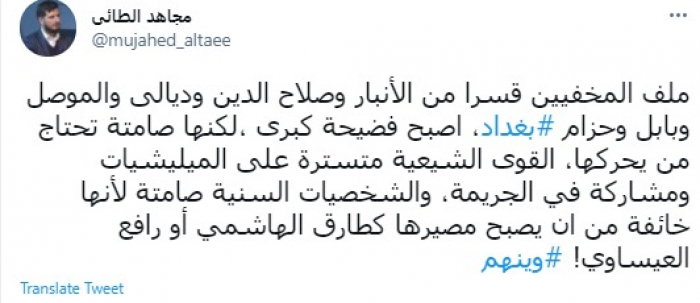 وكتب في تغريدة عبر "تويتر" رصدها "المشهد العربي": "ملف المخفيين قسرا من الأنبار وصلاح الدين وديالى والموصل وبابل وحزام بغداد، أصبح فضيحة كبرى، لكنها صامتة تحتاج من يحركها".