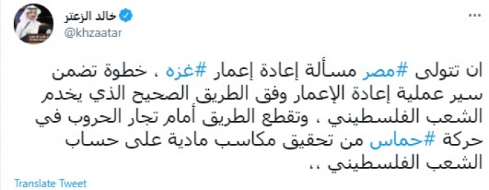 وكتب في تغريدة عبر "تويتر" رصدها "المشهد العربي": "أن تتولى مصر مسألة إعادة إعمار غزة ، خطوة تضمن سير عملية إعادة الإعمار وفق الطريق الصحيح الذي يخدم الشعب الفلسطيني".