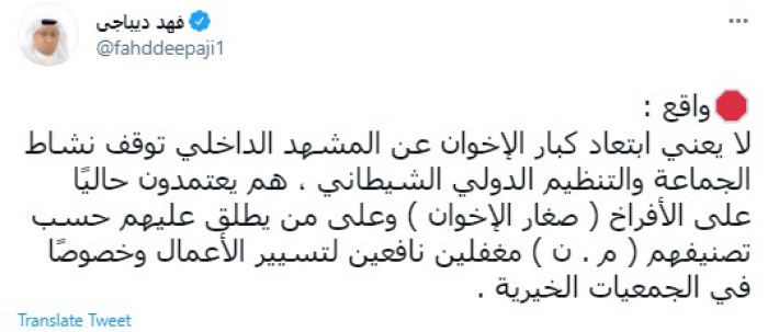 وقال في تغريدة عبر "تويتر" رصدها "المشهد العربي": "واقع: لا يعني ابتعاد كبار الإخوان عن المشهد الداخلي توقف نشاط الجماعة والتنظيم الدولي الشيطاني، هم يعتمدون حاليًا على الأفراخ (صغار الإخوان)".