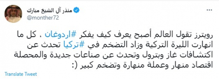 وكتب في تغريدة عبر "تويتر" رصدها "المشهد العربي": "رويترز تقول العالم أصبح يعرف كيف يفكر أردوغان".