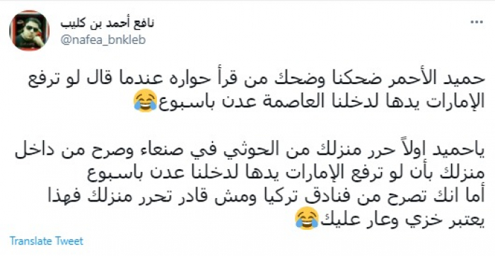 وقال في تغريدة عبر "تويتر" رصدها "المشهد العربي": "حميد الأحمر ضحكنا وضحك من قرأ حواره عندما قال لو ترفع الإمارات يدها لدخلنا العاصمة عدن بأسبوع".
