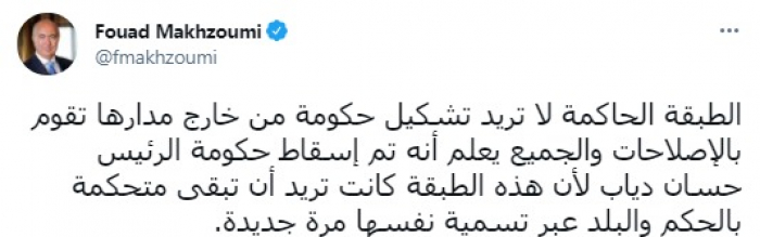 وكتب في تغريدة عبر "تويتر" رصدها "المشهد العربي": "الطبقة الحاكمة لا تريد تشكيل حكومة من خارج مدارها تقوم بالإصلاحات".