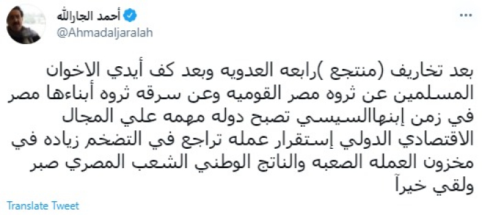 وكتب في تغريدة عبر "تويتر" رصدها "المشهد العربي": "بعد تخاريف (منتجع ) رابعة العدوية وبعد كف أيدي الإخوان المسلمين عن ثروة مصر القومية وعن سرقة ثروة أبناءها".
