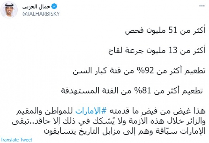 وقال في تغريدة عبر "تويتر" رصدها "المشهد العربي": " أكثر من 51 مليون فحص.. أكثر من 13 مليون جرعة لقاح.. تطعيم أكثر من 92% من فئة كبار السن.. تطعيم أكثر من 81% من الفئة المستهدفة".