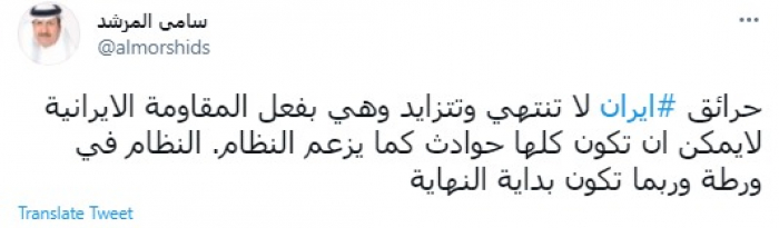 توقع المحلل السياسي السعودي سامي المرشد، اليوم، اقتراب نهاية نظام الملالي في إيران بسبب تعدد وقائع الحرائق في البلاد.