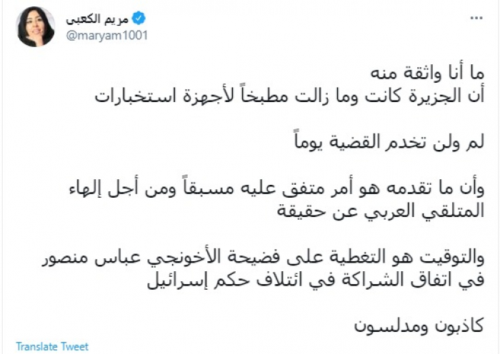 قالت الإعلامية الإماراتية مريم الكعبي، اليوم، إن ما تقدمه قناة الجزيرة القطرية متفق عليه مع أجهزة استخبارات، بهدف إلهاء الشعوب العربي عن الحقائق.