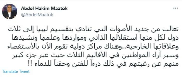 وقال في تغريدة عبر "تويتر" رصدها "المشهد العربي": "تعالت من جديد الأصوات التي تنادي بتقسيم ليبيا إلى ثلاث دول لكل منها استقلالها الذاتي ومواردها وعلمها ونشيدها وعلاقاتها الخارجية".