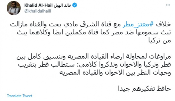وقال في تغريدة عبر "تويتر" رصدها "المشهد العربي": "خلاف معتزمطر مع قناة الشرق مادي بحت والقناه ما زالت تبث سمومها ضد مصر كما قناة مكملين ايضا وكلاهما يبث من تركيا".