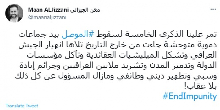 وأضاف: "وتدمير المدن وتشريد ملايين العراقيين وجرائم إبادة وسبي وتطهير ديني وطائفي وما زال المسؤول عن كل ذلك بلا عقاب" –في إشارة لرئيس الوزراء العراقي الأسبق نوري المالكي-.
