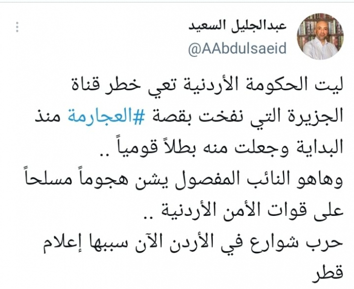 وقال في تغريدة على حسابه بموقع التدوين المصغر تويتر، اليوم إنه: "ليت الحكومة الأردنية تعي خطر قناة الجزيرة التي نفخت بقصة العجارمة منذ البداية وجعلت منه بطلا قوميا".