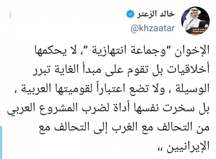 وأشار في تغريدة على حسابه بموقع التدوين المصغر تويتر، اليوم إلى أن: "الإخوان “وجماعة انتهازية ”، لا يحكمها أخلاقيات بل تقوم على مبدأ الغاية تبرر الوسيلة".