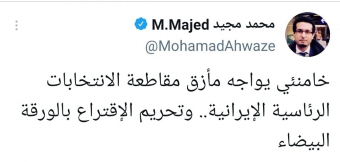 وشدد في تغريدة على حسابه بموقع التدوين المصغر تويتر، اليوم على أن: "خامنئي يواجه مأزق مقاطعة الانتخابات الرئاسية الإيرانية.. وتحريم الإقتراع بالورقة البيضاء".