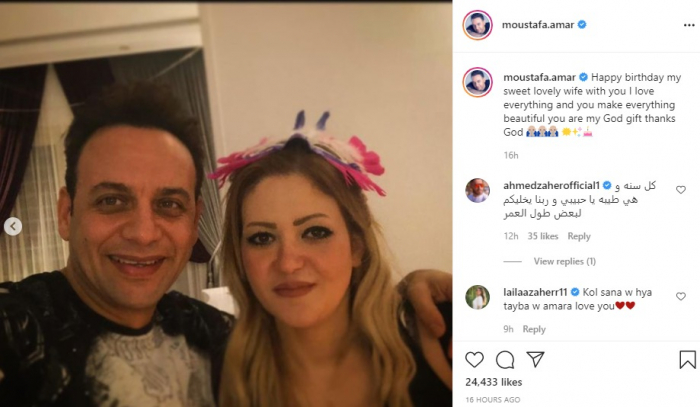 ونشر "قمر" صورًا تجمعهما، عبر حسابه الرسمي بموقع "إنستجرام"، وعلق: "عيد ميلاد سعيد زوجتي الجميلة الحلوة، معك أحب كل شئ، أنت هبة الله، الحمد الله".