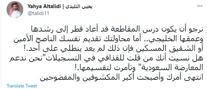 التليدي لـ حمد بن جاسم: انتهى أمرك.. وأصبحت أكبر المكشوفين