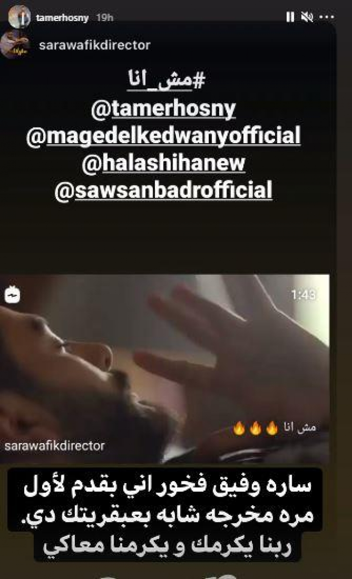 وكتب تامر، عبر "ستوري" حسابه على "انستجرام": "سارة وفيق.. فخور إني بقدم لأول مرة مخرجة شابة بعبقريتك دي.. ربنا يكرمك ويكرمنا معاكي".