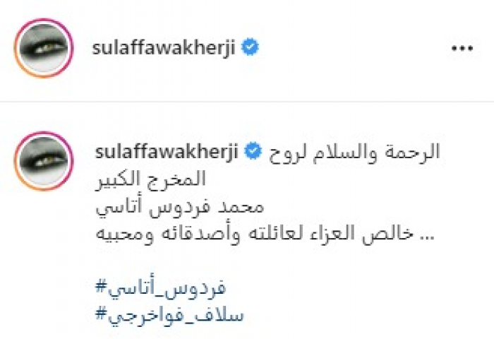 ونشرت "سُلاف" صورة تجمعها بالراحل عبر حسابها الرسمي بموقع "إنستجرام"، وعلّقت: " الرحمة والسلام لروح المخرج الكبير