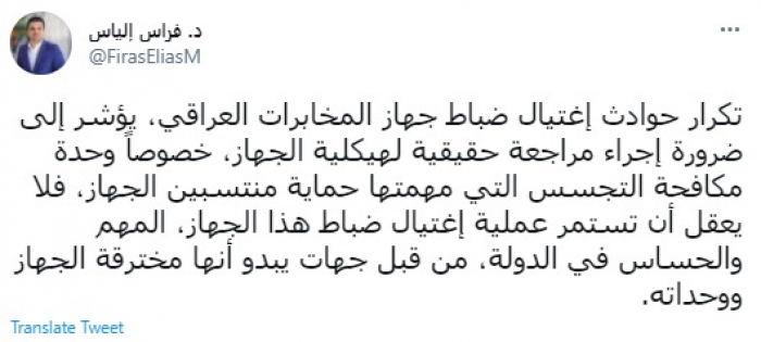 وكتب في تغريدة عبر "تويتر" رصدها "المشهد العربي": "تكرار حوادث إغتيال ضباط جهاز المخابرات العراقي، يؤشر إلى ضرورة إجراء مراجعة حقيقية لهيكلية الجهاز، خصوصاً وحدة مكافحة التجسس التي مهمتها حماية منتسبين الجهاز".
