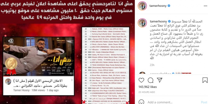 أعلن الفنان تامر حسني عن موعد عرض فيلمه المنتظر "مش أنا".
