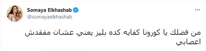 وكتبت "سمية" في تغريدة عبر حسابها على موقع تويتر: "من فضلك يا كورونا كفاية كده.. بليز يعني عشان مفقدش أعصابي".