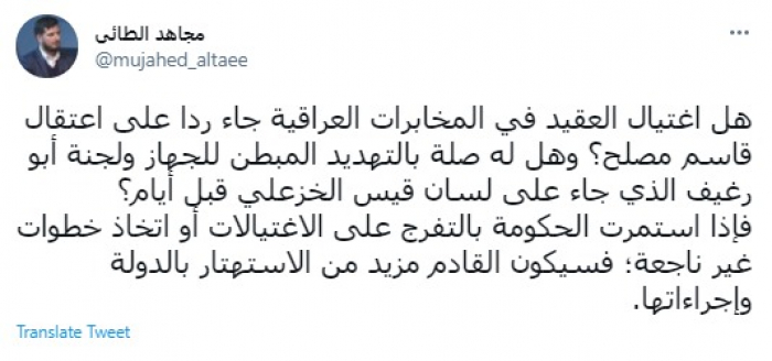 وقال في تغريدة عبر "تويتر" رصدها "المشهد العربي": "هل اغتيال العقيد في المخابرات العراقية جاء ردا على اعتقال قاسم مصلح؟ وهل له صلة بالتهديد المبطن للجهاز ولجنة أبو رغيف الذي جاء على لسان قيس الخزعلي قبل أيام؟".