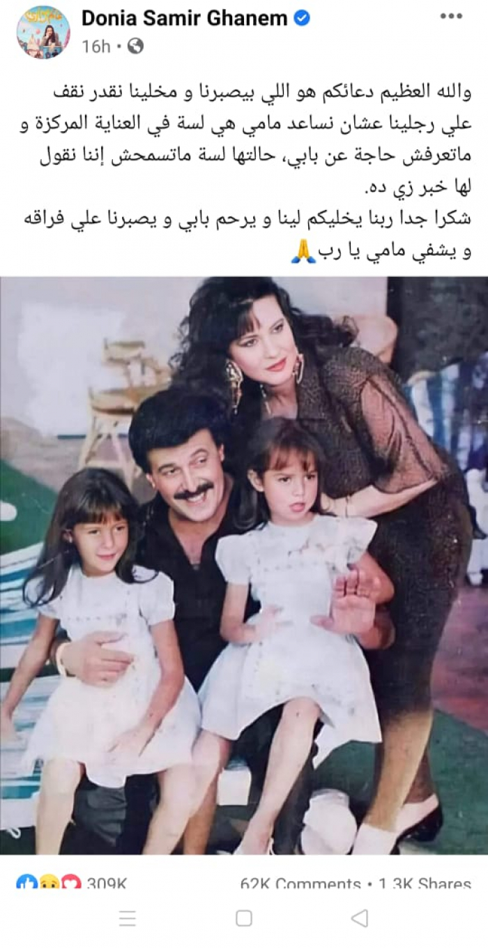 نشرت دنيا عبر صفحتها الرسمية بموقع " فيس بوك" صورة لها من الطفولة تجمعها بعائلتها، وعلقت: " والله العظيم دعاؤكم هو اللي بيصبرنا ومخلينا نقدر نقف على رجلينا عشان نساعد ماما، هي لسة في العناية المركزة وماتعرفش حاجة عن بابا، حالتها لسة ما تسمحش إننا نقول لها خبر زي ده، شكرًا جدًا ربنا يخليكم لينا ويرحم بابا و يصبرنا على فراقه و يشفى ماما يا رب".