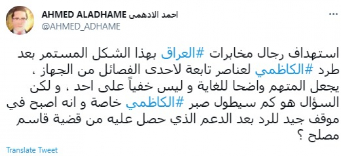 وأضاف: "ولكن السؤال هو كم سيطول صبر الكاظمي خاصة وأنه أصبح في موقف جيد للرد بعد الدعم الذي حصل عليه من قضية قاسم مصلح؟".