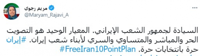 قالت زعيمة المعارضة الإيرانية مريم رجوي، اليوم، إن المعيار الوحيد للحكم على نزاهة الانتخابات الإيرانية هو التصويت الحر والمباشر لأبناء الشعب.