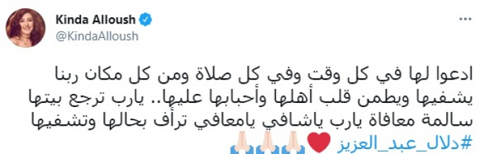 وكتبت كندة :"ادعوا لها في كل وقت، وفي كل صلاة ومن كل مكان ربنا يشفيها ويطمن قلب أهلها وأحبابها عليها".