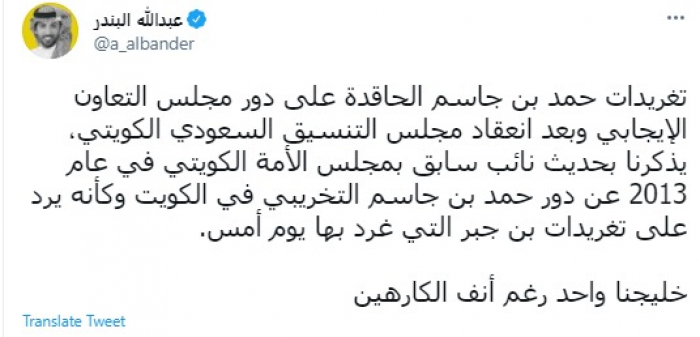 وقال في تغريدة عبر "تويتر" رصدها "المشهد العربي": "تغريدات حمد بن جاسم الحاقدة على دور مجلس التعاون الإيجابي وبعد انعقاد مجلس التنسيق السعودي الكويتي، يذكرنا بحديث نائب سابق بمجلس الأمة الكويتي في عام 2013 عن دور حمد بن جاسم التخريبي في الكويت وكأنه يرد على تغريدات بن جبر التي غرد بها يوم أمس".