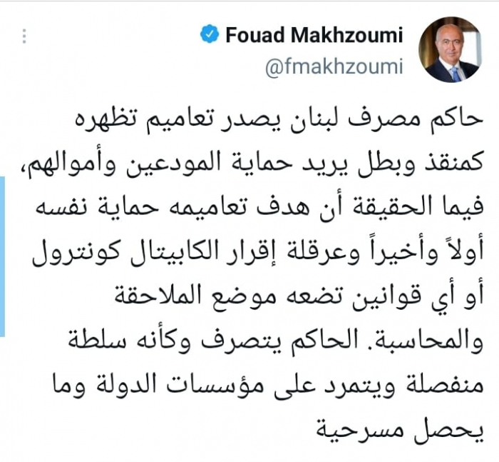 وقال في تغريدة على حسابه بموقع التدوين المصغر تويتر، اليوم إن: "حاكم مصرف لبنان يصدر تعاميم تظهره كمنقذ وبطل يريد حماية المودعين وأموالهم".