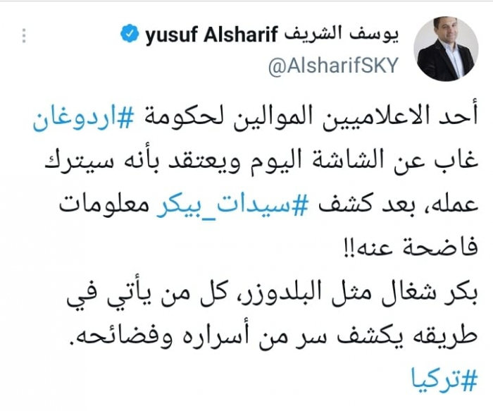 وقال في تغريدة على حسابه بموقع التدوين المصغر تويتر، اليوم إن: "أحد الاعلاميين الموالين لحكومة أردوغان غاب عن الشاشة اليوم ويعتقد بأنه سيترك عمله، بعد كشف سيدات بكر معلومات فاضحة عنه!!".
