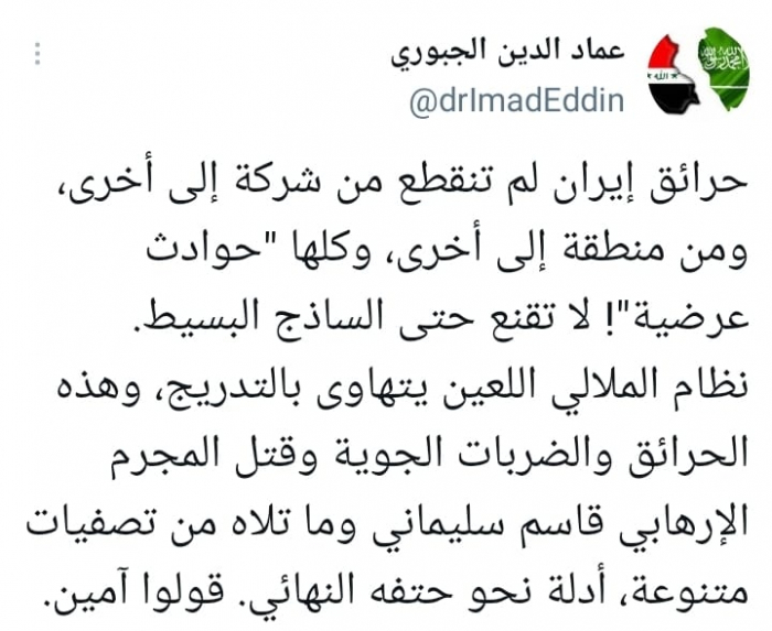 وشدد على أن: "نظام الملالي اللعين يتهاوى بالتدريج، وهذه الحرائق والضربات الجوية وقتل المجرم الإرهابي قاسم سليماني وما تلاه من تصفيات متنوعة، أدلة نحو حتفه النهائي، قولوا آمين".