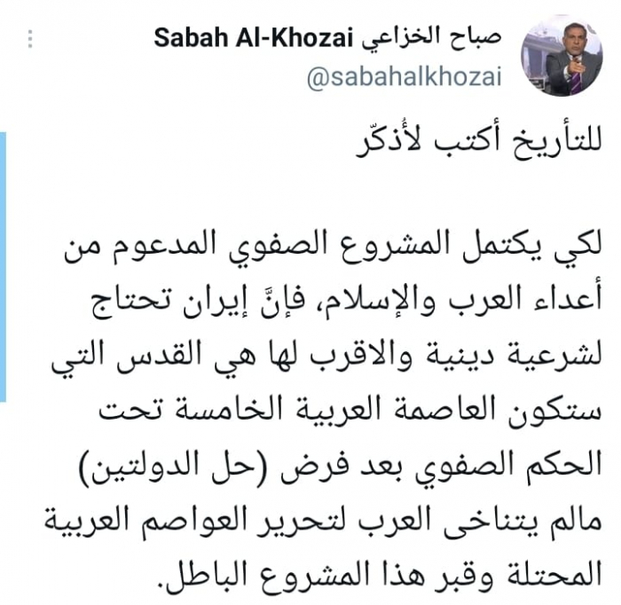وأوضح أن: "الأقرب لها هي القدس التي ستكون العاصمة العربية الخامسة تحت الحكم الصفوي بعد فرض (حل الدولتين)".