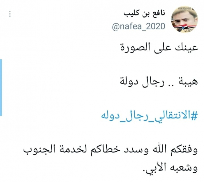 وأضاف أن: "الانتقالي رجال دولة، وفقكم الله وسدد خطاكم لخدمة الجنوب وشعبه الأبي".