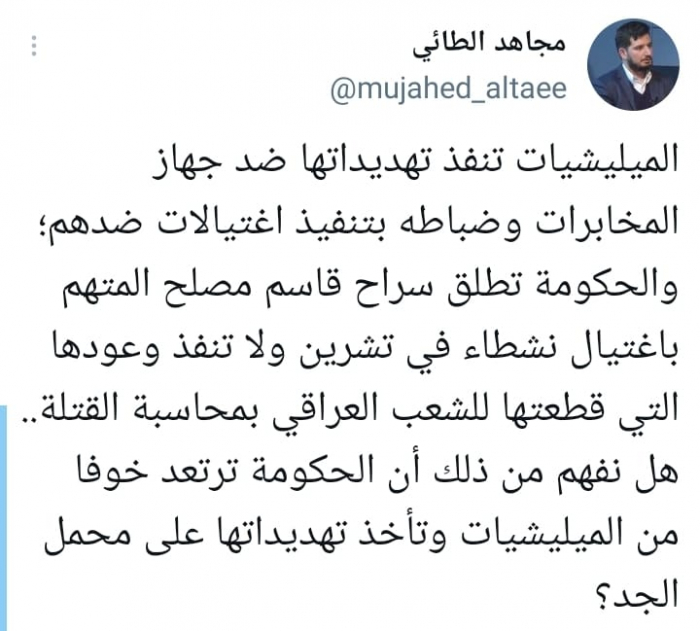 الطائي: المليشيات تنفذ تهديداتها وحكومة العراق تخلف وعودها