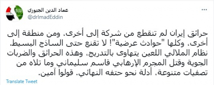 وكتب في تغريدة عبر "تويتر" رصدها "المشهد العربي": "حرائق إيران لم تنقطع من شركة إلى أخرى، ومن منطقة إلى أخرى، وكلها حوادث عرضية" لا تقنع حتى الساذج البسيط".