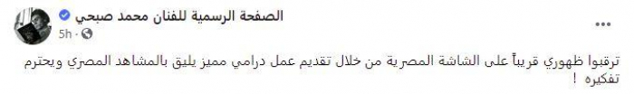وكتب صبحي، عبر صفحته الرسمية على موقع "فيسبوك": "ترقبوا ظهوري قريبًا على الشاشة المصرية من خلال تقديم عمل درامي مميز يليق بالمشاهد المصري ويحترم تفكيره".
