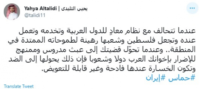 وقال في تغريدة عبر "تويتر" رصدها "المشهد العربي": "عندما تتحالف مع نظام معادٍ للدول العربية وتخدمه وتعمل عنده وتجعل فلسطين وشعبها رهينة لطموحاته الممتدة في المنطقة".