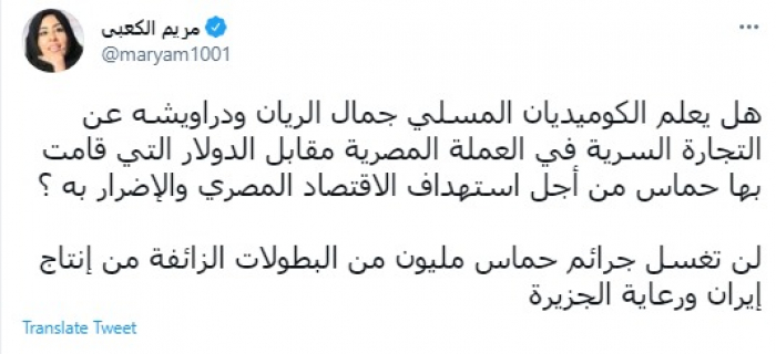 وقالت في تغريدة عبر "تويتر" رصدها "المشهد العربي": "هل يعلم الكوميديان المسلي جمال الريان ودراويشه عن التجارة السرية في العملة المصرية مقابل الدولار التي قامت بها حماس من أجل استهداف الاقتصاد المصري والإضرار به؟".