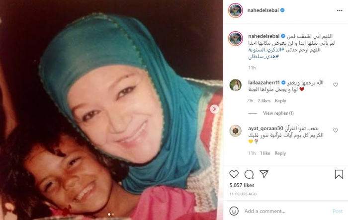 ونشرت "ناهد" صورة لها مع جدتها عبر حسابها بموقع "إنستجرام"، وعلقت: "اللهم إني اشتقت لمن لم يأتي مثلها أبدا ولن يعوض مكانها أحدا.. اللهم ارحم جدتي.. الذكرى السنوية لهدى سلطان".