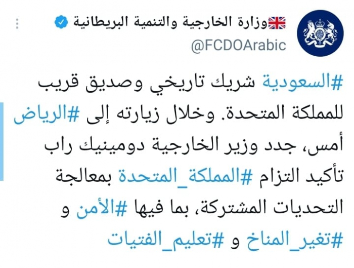 وأشارت وزارة الخارجية البريطانية في تغريدة على حسابها بموقع التدوين المصغر تويتر، اليوم إلى أن: "السعودية شريك تاريخي وصديق قريب للمملكة المتحدة".