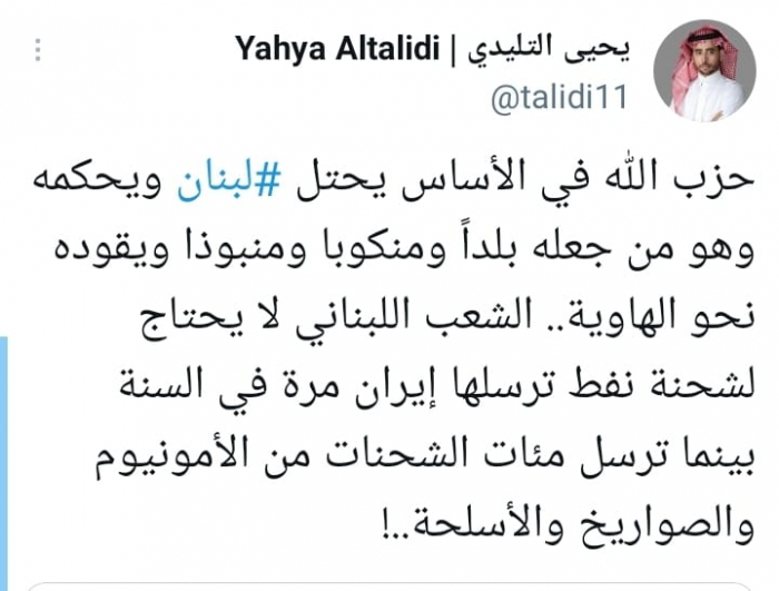 وقال في تغريدة على حسابه بموقع التدوين المصغر تويتر، اليوم إن: "حزب الله في الأساس يحتل لبنان ويحكمه وهو من جعله بلداً ومنكوبا ومنبوذا ويقوده نحو الهاوية".
