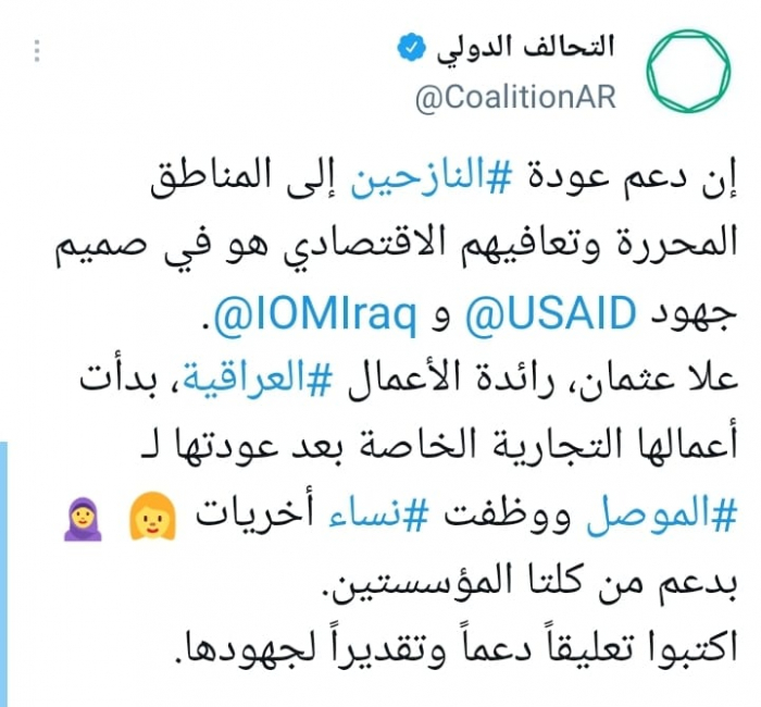 وتابع: "علا عثمان، رائدة الأعمال العراقية، بدأت أعمالها التجارية الخاصة بعد عودتها للموصل ووظفت نساء أخريات بدعم من كلتا المؤسستين"، مختتما: "اكتبوا تعليقاً دعماً وتقديراً لجهودها".