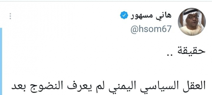 وأكد في تغريدة على حسابه بموقع التدوين المصغر تويتر، اليوم أنه: "حقيقة .. العقل السياسي اليمني لم يعرف النضوج بعد".