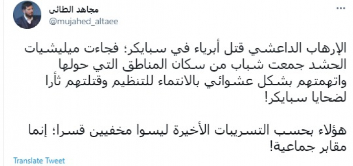وقال في تغريدة عبر "تويتر" رصدها "المشهد العربي": "الإرهاب الداعشي قتل أبرياء في سبايكر؛ فجاءت ميليشيات الحشد جمعت شباب من سكان المناطق التي حولها واتهمتهم بشكل عشوائي بالانتماء للتنظيم وقتلتهم ثأرا لضحايا سبايكر".