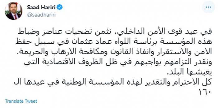 وقال في تغريدة عبر "تويتر" رصدها "المشهد العربي": "في عيد قوى الأمن الداخلي، نثمن تضحيات عناصر وضباط هذه المؤسسة برئاسة اللواء عماد عثمان في سبيل حفظ الامن والاستقرار وإنفاذ القانون ومكافحة الارهاب والجريمة".