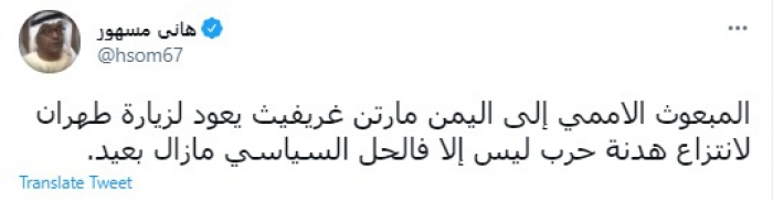 وقال في تغريدة عبر "تويتر" رصدها "المشهد العربي": "المبعوث الاممي إلى اليمن مارتن غريفيث يعود لزيارة طهران لانتزاع هدنة حرب ليس إلا فالحل السياسي ما زال بعيد".