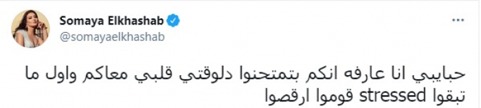 وكتبت "سمية" في تغريدة عبر حسابها الرسمي بموقع "تويتر" :"حبايبي أنا عارفة أنكم بتمتحنوا دلوقتي، قلبي معاكم وأول ما تبقوا (stressed) قوموا ارقصوا".