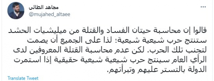 وكتب في تغريدة عبر "تويتر" رصدها "المشهد العربي": "قالوا إن محاسبة حيتان الفساد والقتلة من مليشيات الحشد ستنتج حربا شيعية شيعية؛ لذا على الجميع أن يصمت لتجنب تلك الحرب".