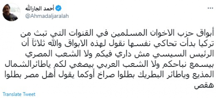 وقال في تغريدة عبر "تويتر" رصدها "المشهد العربي": "أبواق حزب الإخوان المسلمين في القنوات التي تبث من تركيا بدأت تحاكي نفسها نقول لهذه الأبواق والله ثلاثا أن الرئيس السيسي مش داري فيكم ولا الشعب المصري بيسمع نباحكم ولا الشعب العربي بيصغي لكم".